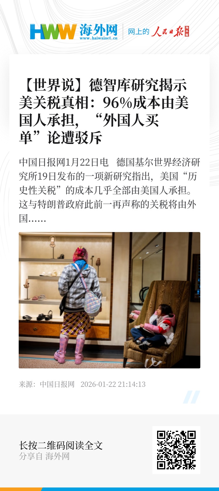 基尔研究所的研究人员分析了2024年1月至2025年11月期间价值4万亿美元的货物运输情况,发现外国出口商通过降低价格仅承担了约4%的关税上涨成本,其余96%均由美国消费者及进口商承担。
