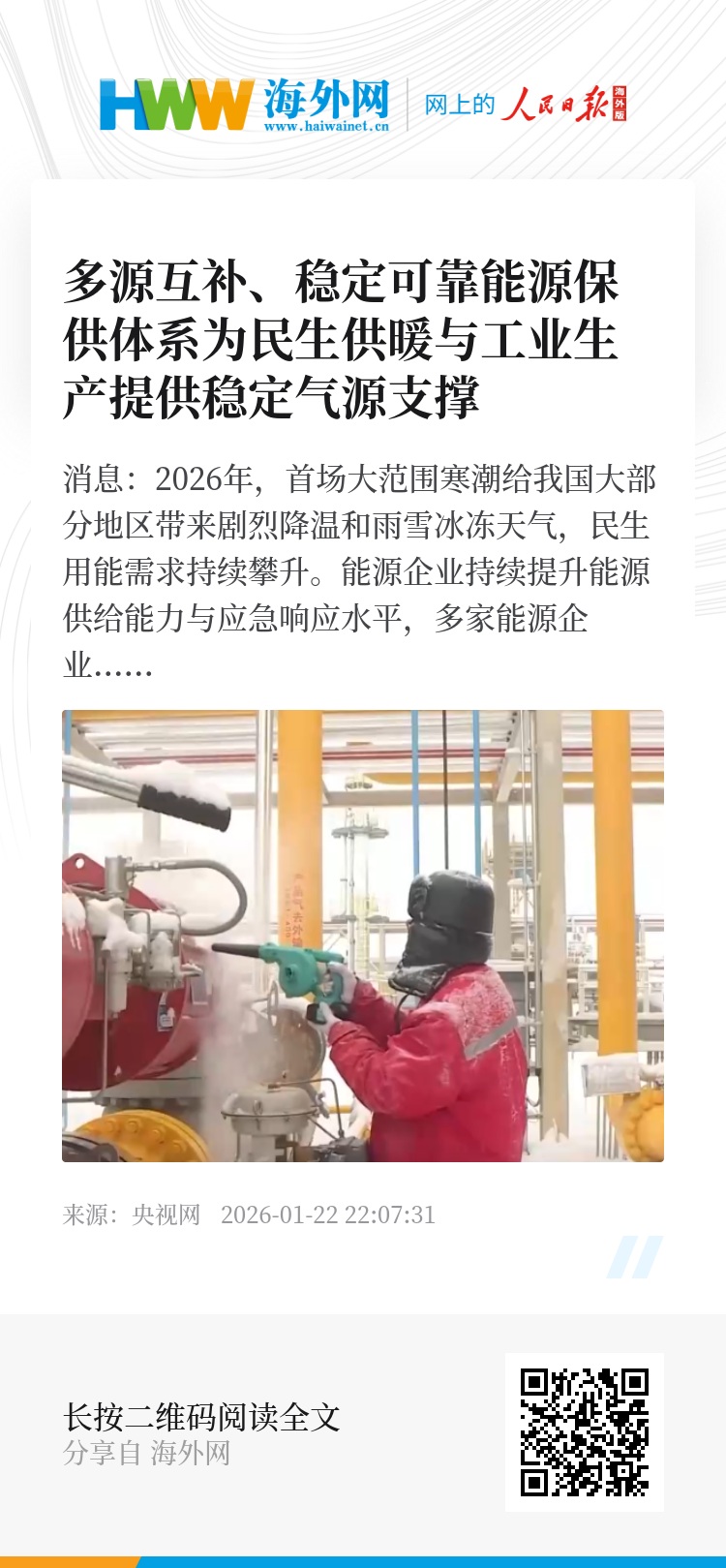 央视网消息:2026年,首场大范围寒潮给我国大部分地区带来剧烈降温和雨雪冰冻天气,民生用能需求持续攀升。能源企业持续提升能源供给能力与应急响应水平,多家能源企业日供气量创新高。