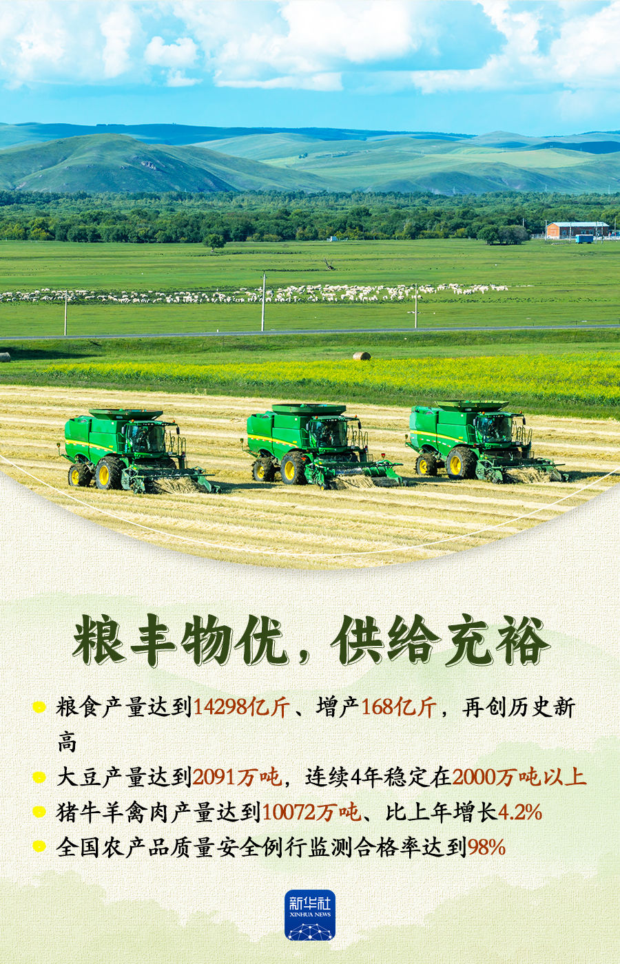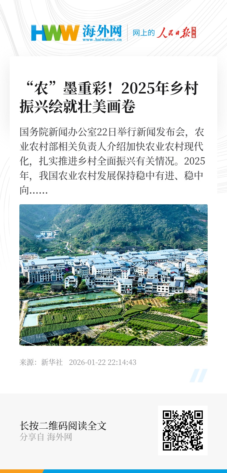国务院新闻办公室22日举行新闻发布会,农业农村部相关负责人介绍加快农业农村现代化,扎实推进乡村全面振兴有关情况。2025年,我国农业农村发展保持稳中有进、稳中向好的势头,为推动经济社会高质量发展提供了基础支撑。跟随这组海报,一起来看。