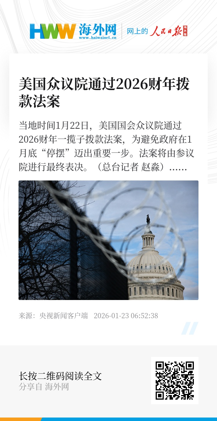 当地时间1月22日,美国国会众议院通过2026财年一揽子拨款法案,为避免政府在1月底“停摆”迈出重要一步。法案将由参议院进行最终表决。(总台记者 赵淼)