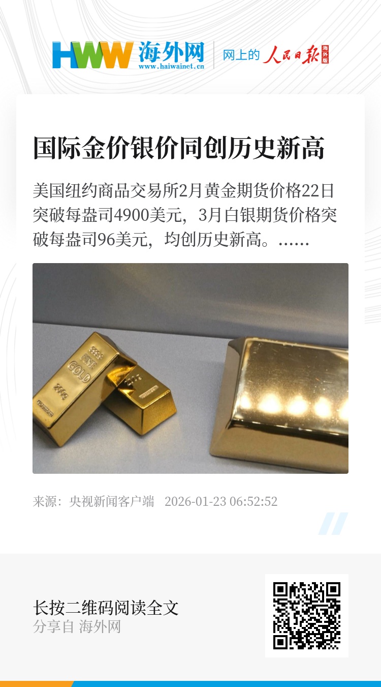 美国纽约商品交易所2月黄金期货价格22日突破每盎司4900美元,3月白银期货价格突破每盎司96美元,均创历史新高。