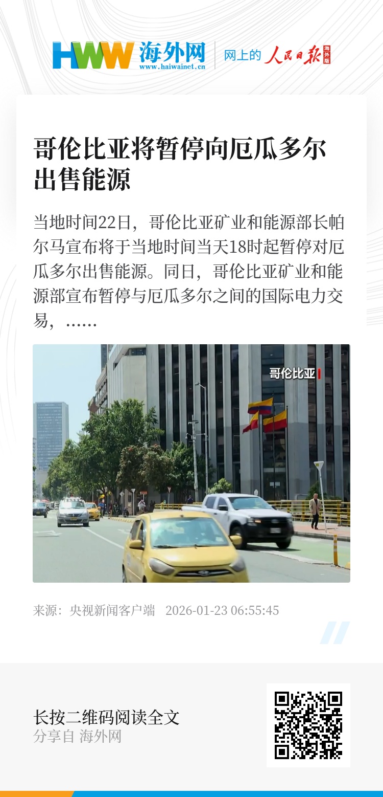 同日,哥伦比亚矿业和能源部宣布暂停与厄瓜多尔之间的国际电力交易,表示这一举措是保护国家能源主权与安全的预防性措施,哥政府需优先保障国内电力供应。