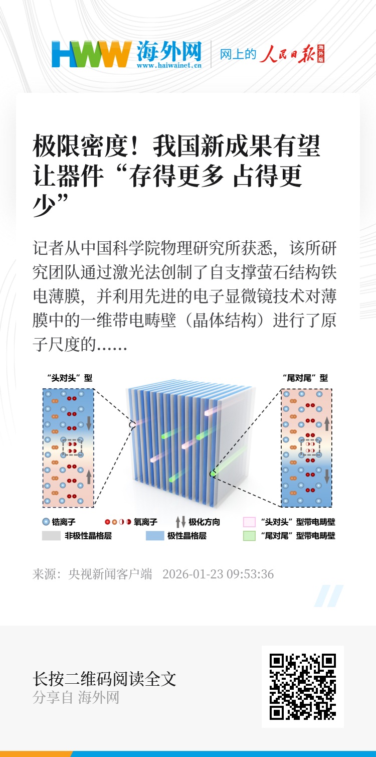 科研团队发现这些带电畴壁被约束在极性晶格层中,厚度和宽度均具有埃级尺寸(约为人类头发直径的数十万分之一),畴壁处过量的氧离子或氧空位充当了黏结的“胶水”稳定了这些带电的畴壁。研究团队利用电子辐照产生的局部电场演示了对这些一维带电畴壁的人工操控。这一研究成果颠覆了人们对于畴壁结构的传统认知,并为开发具有极限密度的人工智能器件提供了科学基础。(总台央视记者 帅俊全 褚尔嘉)