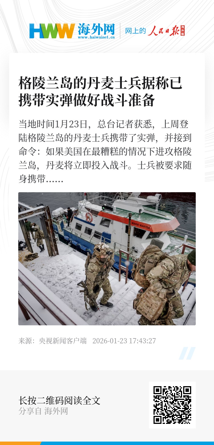 当地时间1月23日,总台记者获悉,上周登陆格陵兰岛的丹麦士兵携带了实弹,并接到命令:如果美国在最糟糕的情况下进攻格陵兰岛,丹麦将立即投入战斗。士兵被要求随身携带这些弹药,以便在必要时立即投入战斗。国防部向丹麦士兵下达的长达数页的命令指出,国防部必须尽快加强执行格陵兰防御计划的能力。