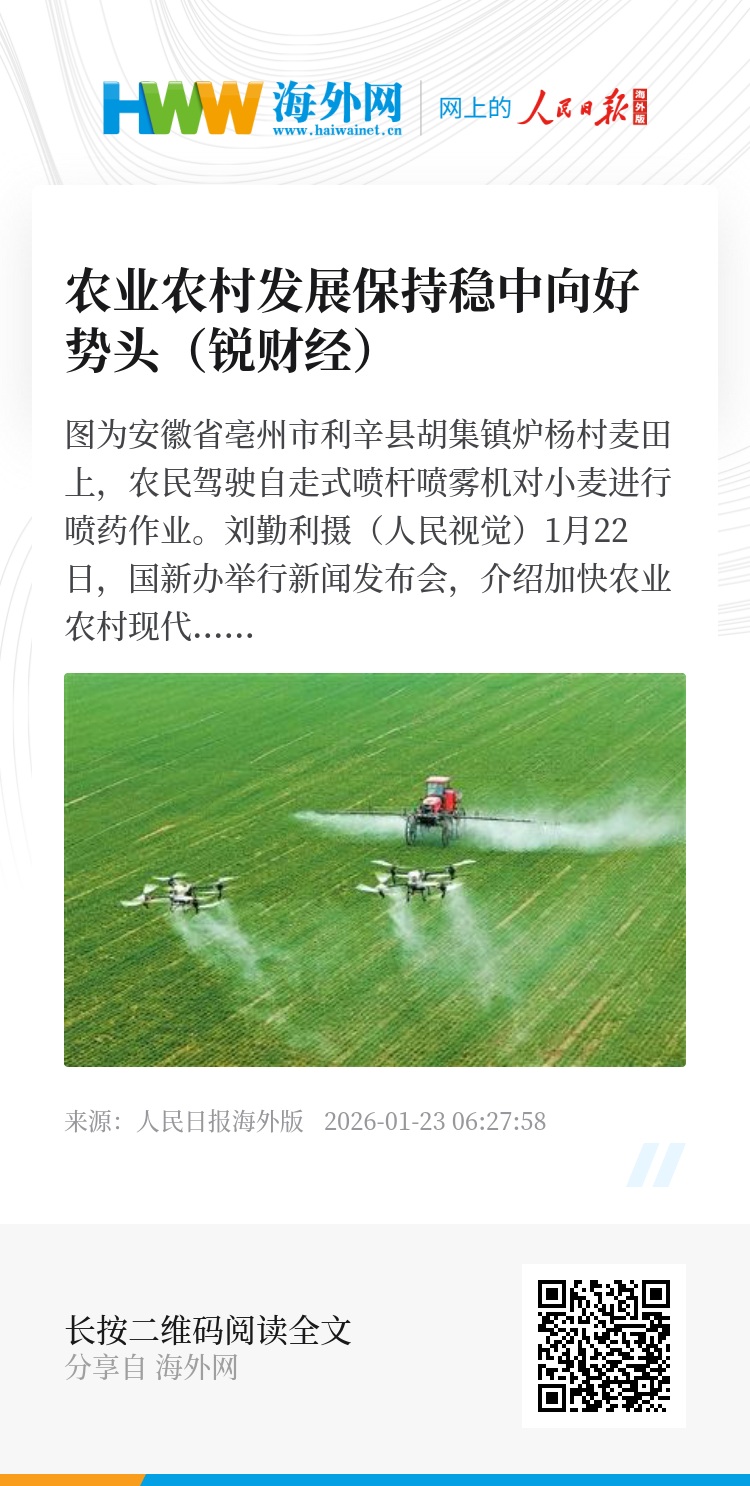 1月22日,国新办举行新闻发布会,介绍加快农业农村现代化,扎实推进乡村全面振兴有关情况。农业农村部副部长张兴旺在会上表示,2025年,各级农业农村部门扎实有力推进乡村全面振兴和农业强国建设重点工作,农业农村发展保持了稳中有进、稳中向好的势头,全年和“十四五”各项目标任务顺利完成,为推动经济社会高质量发展提供了基础支撑。