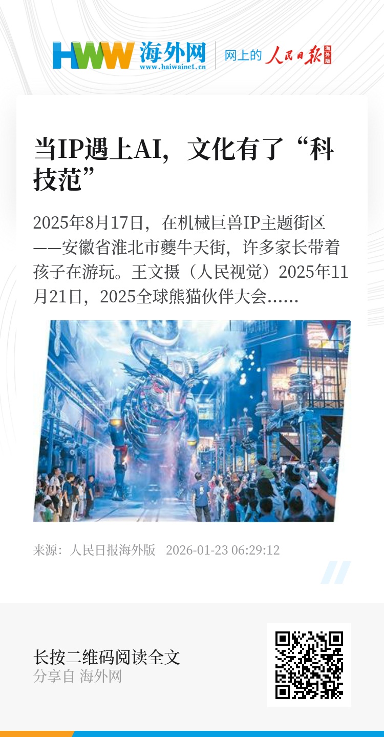 在人工智能技术迅猛发展的今天,生成式AI、大模型等数字工具正与各类文艺IP(具有可识别性、情感价值和商业延展性的“文化符号或内容载体”)深度碰撞融合,让沉睡千年的文物走出展柜,让源远流长的传统文化焕发新的时代光彩。当IP遇上AI,文化有了“科技范”。从博物馆的智能讲解到非遗工坊的数字创新,从版权保护的技术升级到文化出海的效能提升,AI正以科技之力为文化IP注入全新活力,勾勒出“科技+文化”的融合新图景。