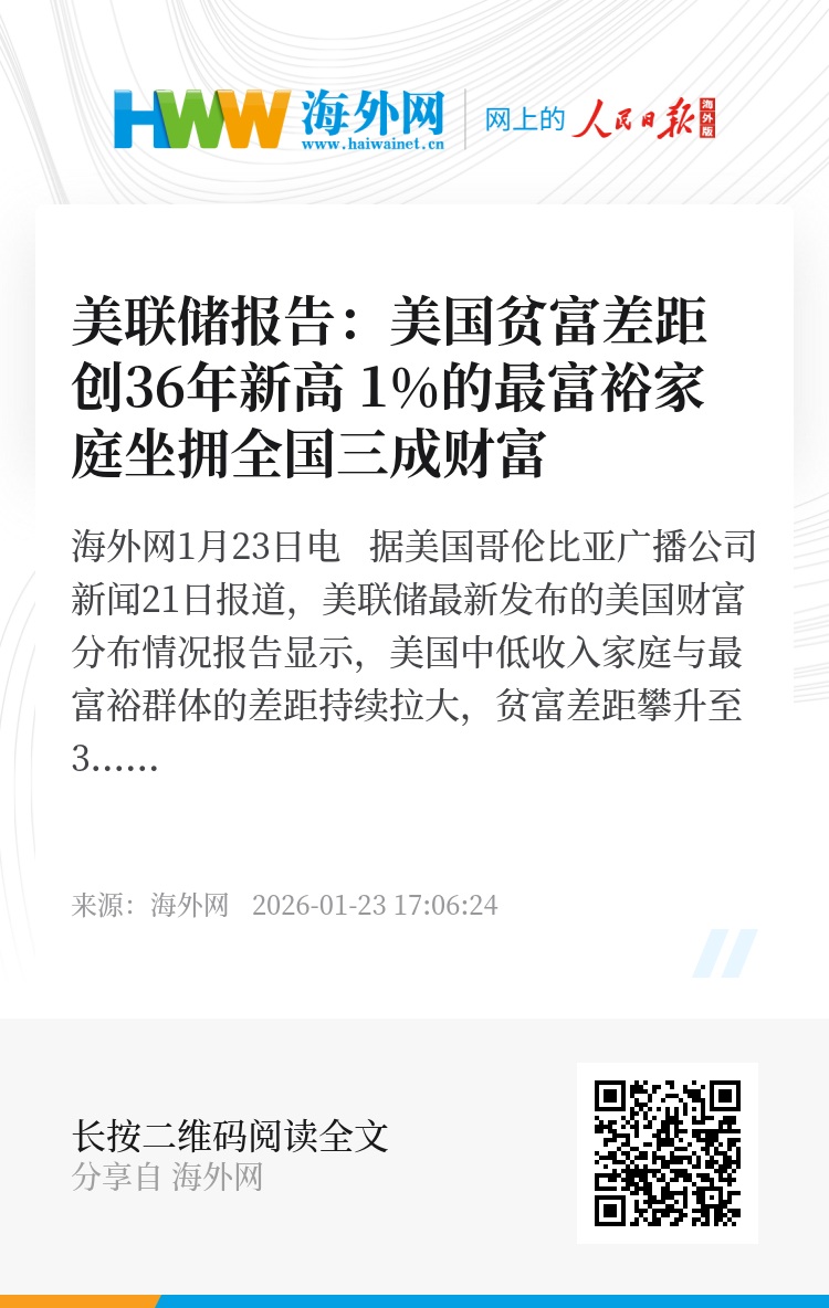 海外网1月23日电 据美国哥伦比亚广播公司新闻21日报道,美联储最新发布的美国财富分布情况报告显示,美国中低收入家庭与最富裕群体的差距持续拉大,贫富差距攀升至36年来最高水平。