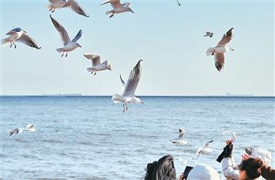图为金梦海湾海滩,海鸥正在觅食。