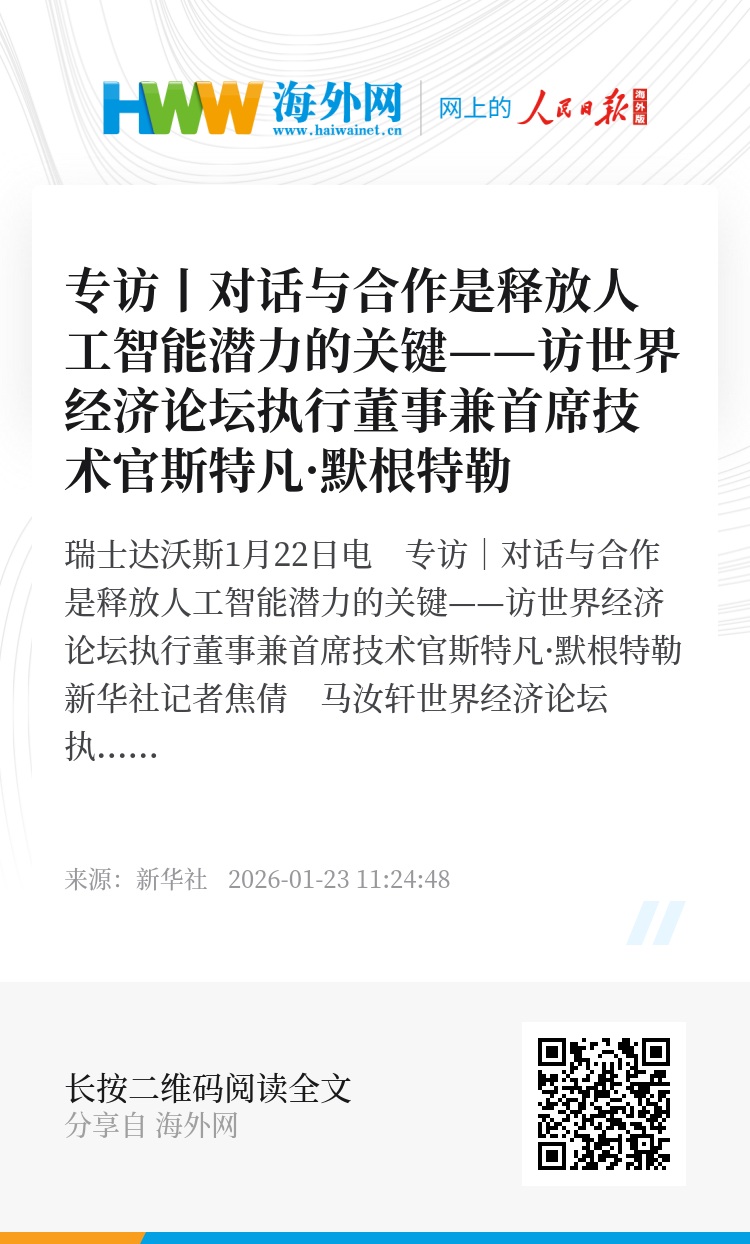 世界经济论坛执行董事兼首席技术官斯特凡·默根特勒在世界经济论坛2026年年会期间接受新华社记者专访时表示,要想人工智能技术今后对经济和社会产生外界普遍期待的积极影响,就必须开展广泛的对话与合作。