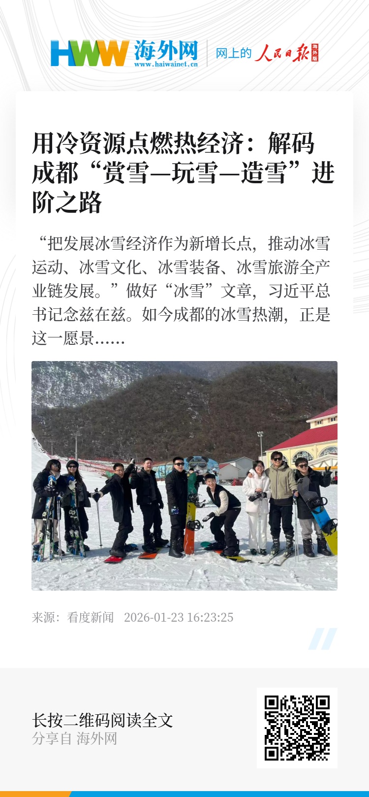 “把发展冰雪经济作为新增长点,推动冰雪运动、冰雪文化、冰雪装备、冰雪旅游全产业链发展。”做好“冰雪”文章,习近平总书记念兹在兹。如今成都的冰雪热潮,正是这一愿景的生动实践。
