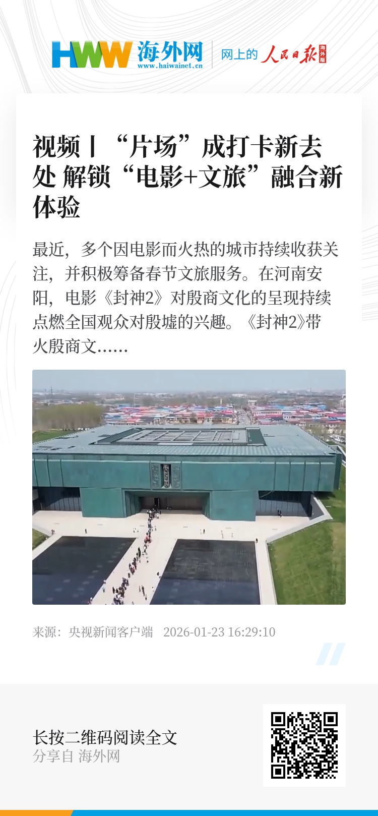 最近,多个因电影而火热的城市持续收获关注,并积极筹备春节文旅服务。在河南安阳,电影《封神2》对殷商文化的呈现持续点燃全国观众对殷墟的兴趣。
