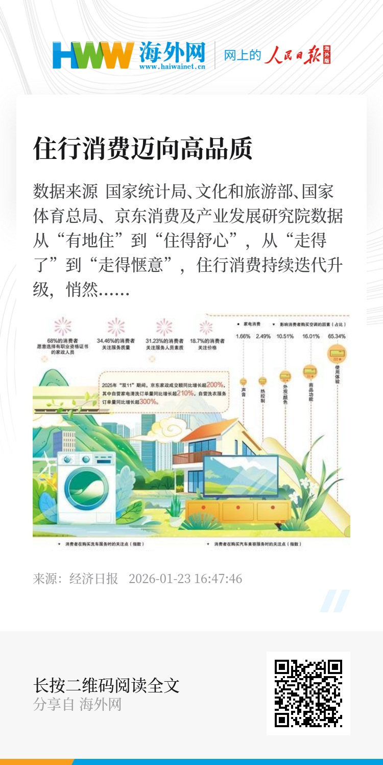 住行消费的品质升级,背后是消费观念的成熟与生活水平的提升。从居住空间的情感赋能到出行过程的体验升级,从细分产品的精准适配到服务模式的不断优化,人们对美好生活的追求正在转化为实实在在的消费选择。这种升级不仅重塑了住行消费市场的供给格局,更彰显了消费对生活品质的引领作用,而在需求与供给的双向驱动下,高品质的住行生活将成为更多人的日常。(作者:李瞳 来源:经济日报)
