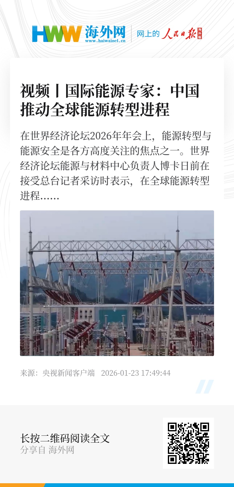 在世界经济论坛2026年年会上,能源转型与能源安全是各方高度关注的焦点之一。世界经济论坛能源与材料中心负责人博卡日前在接受总台记者采访时表示,在全球能源转型进程中,中国在清洁能源产业化、电气化发展以及成本降低方面发挥了引领性作用,为全球绿色转型提供了重要支撑。