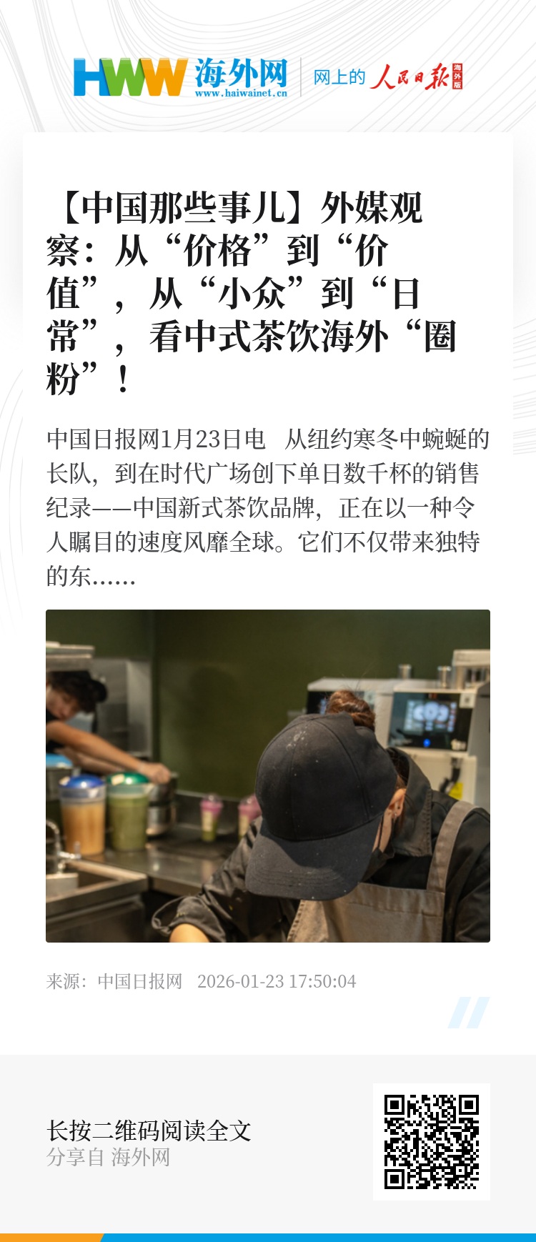 中国日报网1月23日电 从纽约寒冬中蜿蜒的长队,到在时代广场创下单日数千杯的销售纪录——中国新式茶饮品牌,正在以一种令人瞩目的速度风靡全球。它们不仅带来独特的东方风味,更以高性价比、持续创新和文化亲和力跨越地理与文化的边界,悄然连接起东西方的生活方式。