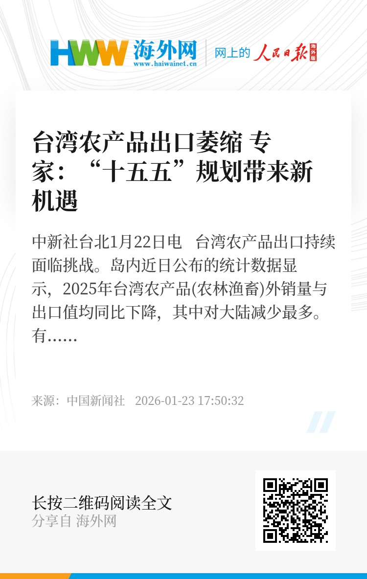 中新社台北1月22日电 台湾农产品出口持续面临挑战。岛内近日公布的统计数据显示,2025年台湾农产品(农林渔畜)外销量与出口值均同比下降,其中对大陆减少最多。有台湾农业专家表示,两岸农业互补性强,大陆的“十五五”规划为合作提供新契机。