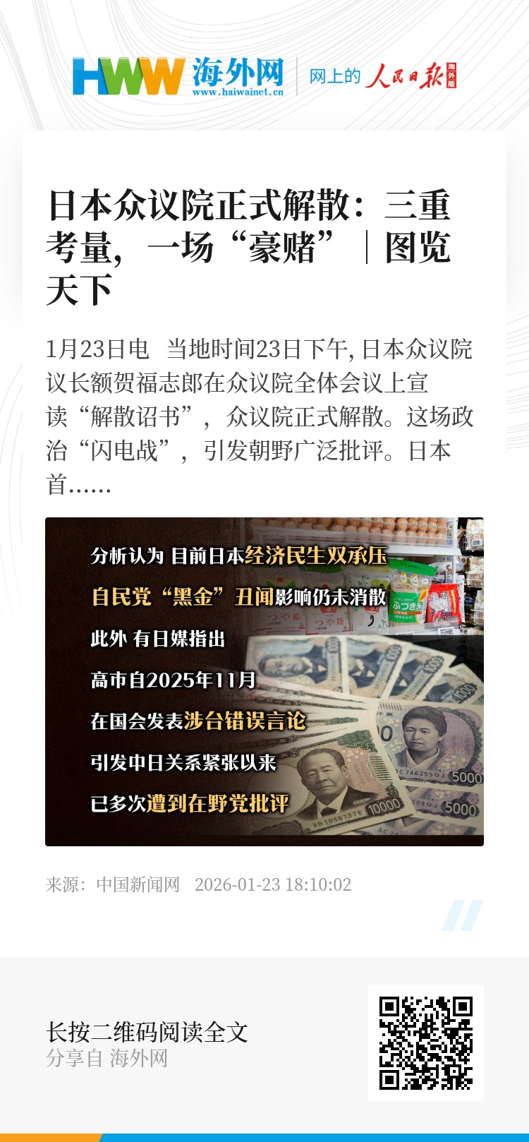 中新网1月23日电 当地时间23日下午,日本众议院议长额贺福志郎在众议院全体会议上宣读“解散诏书”,众议院正式解散。这场政治“闪电战”,引发朝野广泛批评。日本首相高市早苗为何选择此时解散众议院?大选结果对日本政坛有何影响?一图速览↓