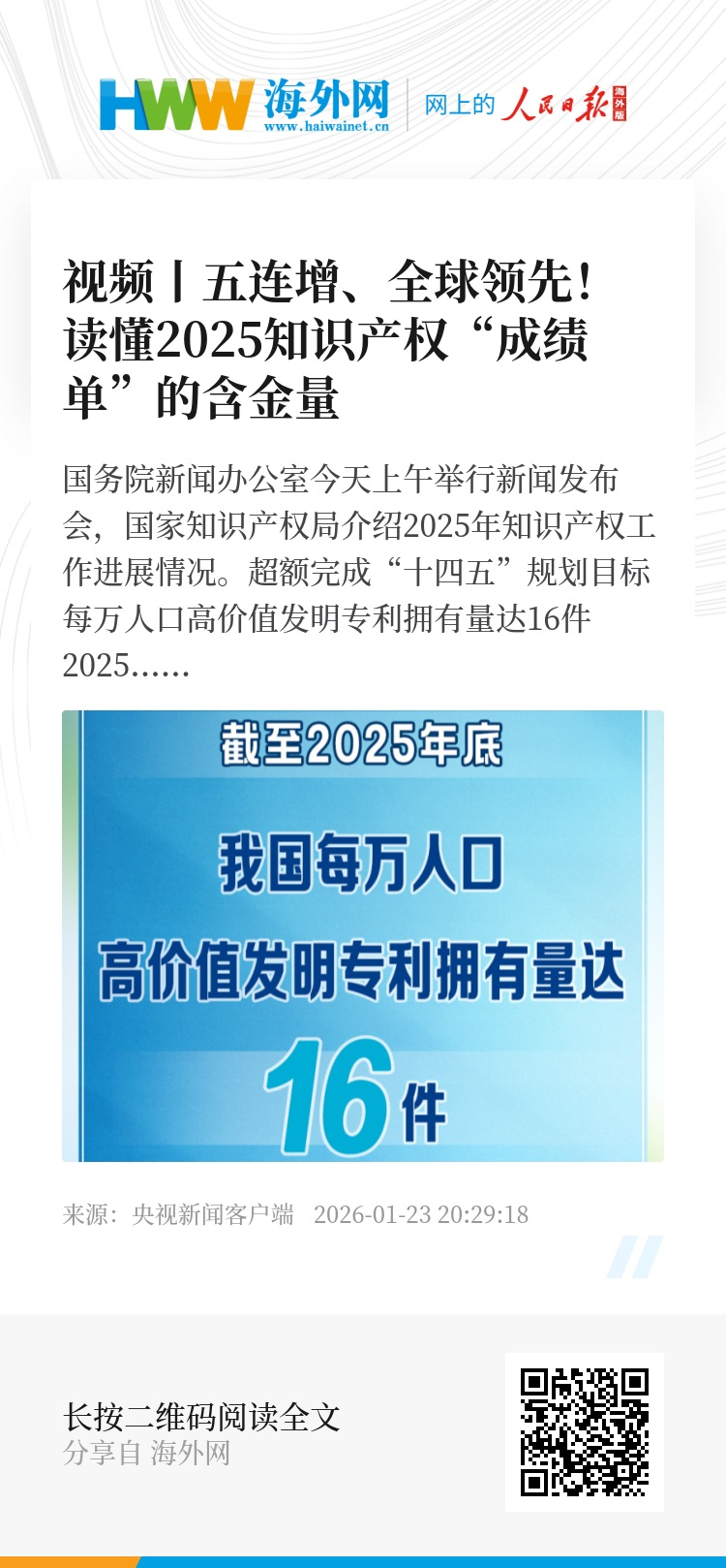 截至2025年底,我国国内(不含港澳台)发明专利有效量达到532万件,每万人口高价值发明专利拥有量达到16件。