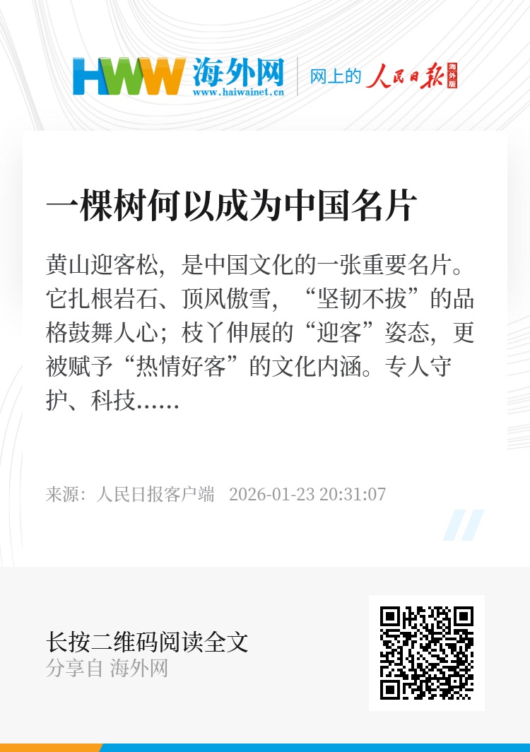 黄山迎客松,是中国文化的一张重要名片。它扎根岩石、顶风傲雪,“坚韧不拔”的品格鼓舞人心;枝丫伸展的“迎客”姿态,更被赋予“热情好客”的文化内涵。专人守护、科技赋能,人们精心呵护下,千年迎客松广迎八方客。