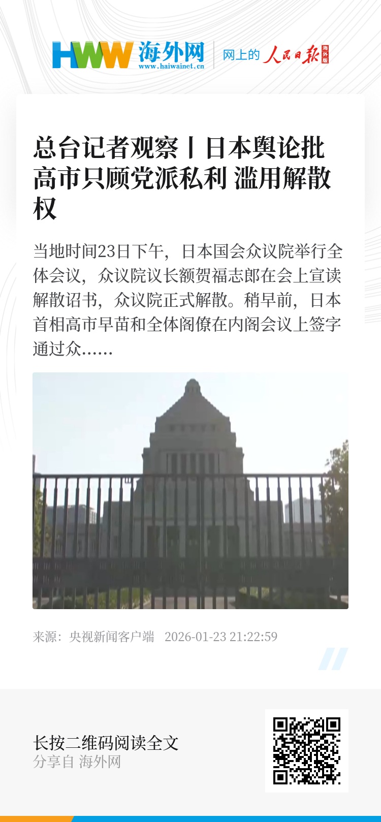 总台记者 何欣蕾:这次解散众议院的时间节点格外引人关注。1月23日,众议院正式解散,现任议员在职仅454天,这使得本届众议院成为日本历史上任期第三短的众议院。在严寒2月举行大选,在日本历史上也比较罕见。而且,在没有出现内阁不信任案的情况下,由首相主动决定解散众议院的情况,更是罕见。日本多家媒体刊发社论,批评高市早苗只顾党派私利、滥用解散权。
