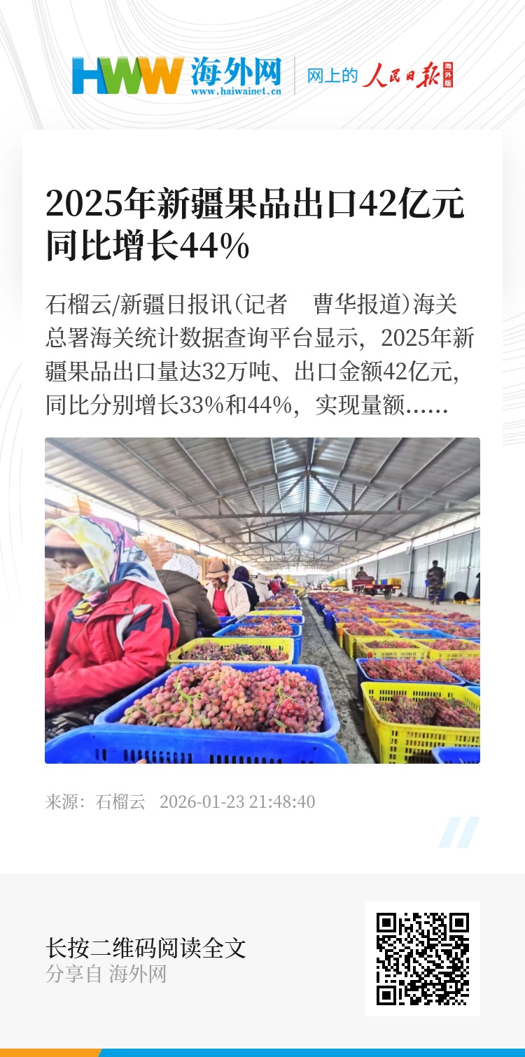 石榴云/新疆日报讯(记者 曹华报道)海关总署海关统计数据查询平台显示,2025年新疆果品出口量达32万吨、出口金额42亿元,同比分别增长33%和44%,实现量额双增。