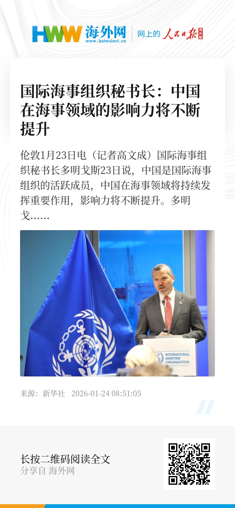 新华社伦敦1月23日电(记者高文成)国际海事组织秘书长多明戈斯23日说,中国是国际海事组织的活跃成员,中国在海事领域将持续发挥重要作用,影响力将不断提升。