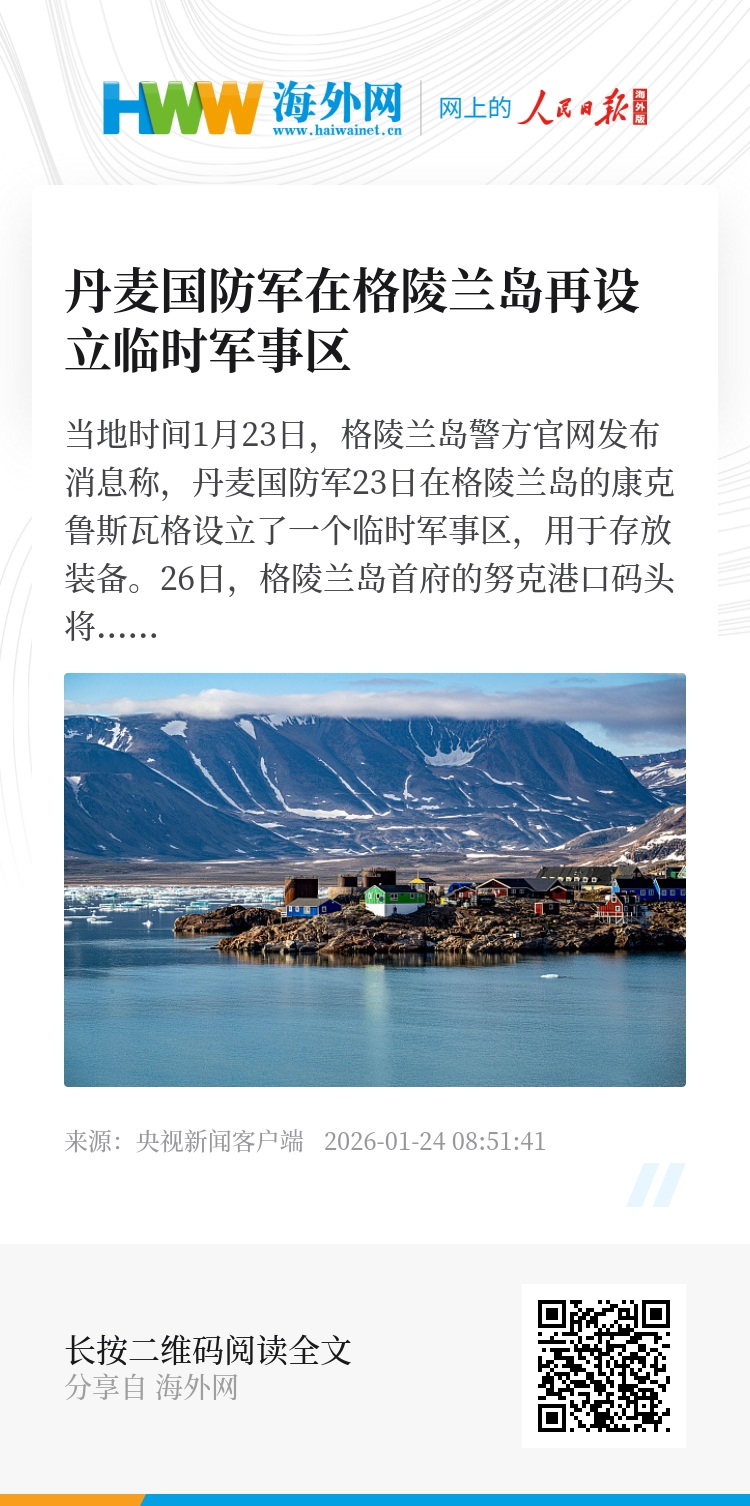 当地时间1月23日,格陵兰岛警方官网发布消息称,丹麦国防军23日在格陵兰岛的康克鲁斯瓦格设立了一个临时军事区,用于存放装备。26日,格陵兰岛首府的努克港口码头将设立另一临时军事区。