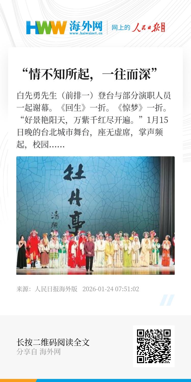 “台北,我们来啦!”1月13日,团员们飞抵台湾,但他们顾不得浏览美景,就一头扎进城市舞台,投入紧张的布台和排练。15日晚上的正式演出,吸引了岛内各地观众慕名而来,其中大多是年轻人,他们用如潮掌声给了团员们最大的嘉勉。喜欢传统戏曲的廖伟伦,曾经研读过《牡丹亭》戏文,之前也看过青春版《牡丹亭》,这次他特地叫上同学一同来欣赏校园青春版《牡丹亭》。“有人觉得戏曲是老一辈的爱好,但‘青春化’的《牡丹亭》让经典更贴近年轻人,让我们共情。”廖伟伦受访时表示,台湾喜爱京剧、昆曲的年轻人并不少,身边也有不少同好。希望未来有更多这类演出,也期盼能和大陆同龄爱好者交流学习。演出结束,与大家一同欣赏完全剧的白先勇先生登上舞台,与部分演职人员一起谢幕。
