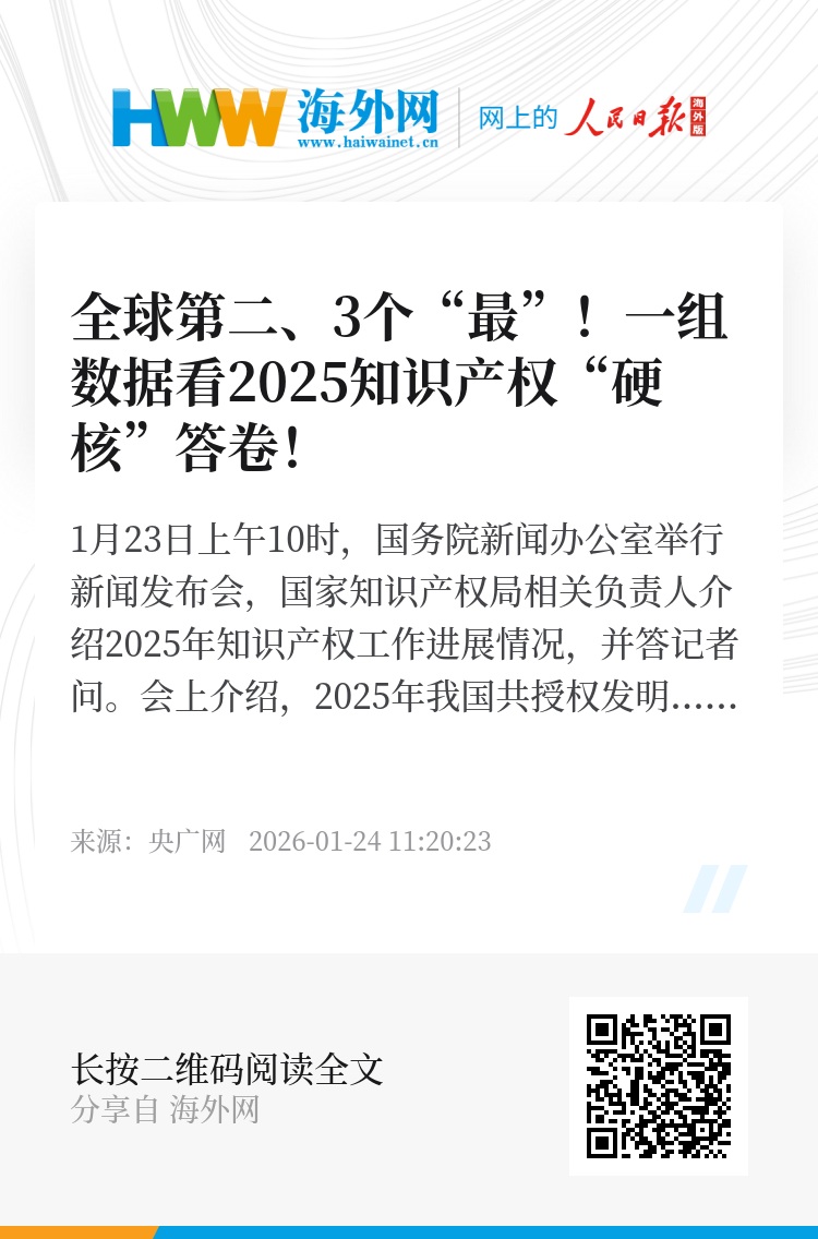 1月23日上午10时,国务院新闻办公室举行新闻发布会,国家知识产权局相关负责人介绍2025年知识产权工作进展情况,并答记者问。会上介绍,2025年我国共授权发明专利97.2万件,专利密集型产业增加值突破18万亿元,全球前5000个品牌中我国品牌价值位居全球第二……戳图!一组数据看国家知识产权工作重大成就!