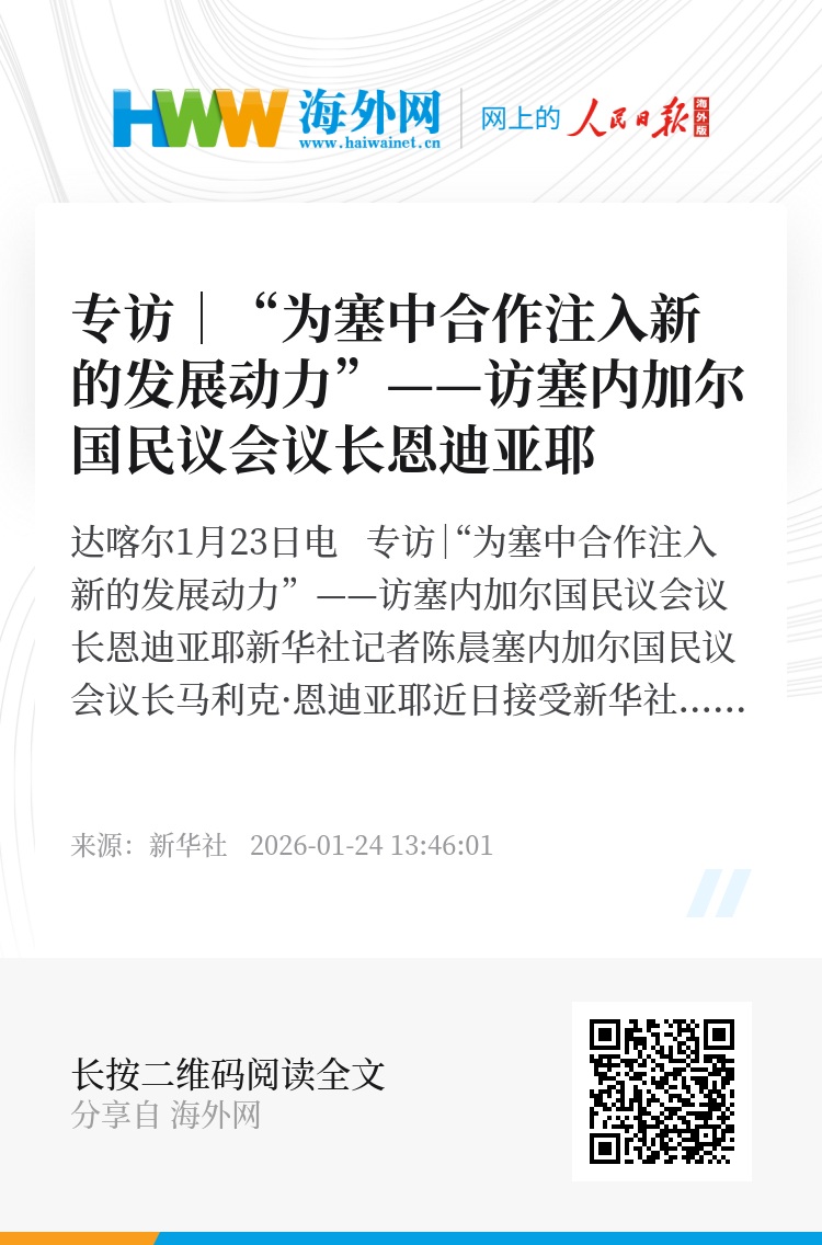恩迪亚耶表示,塞内加尔是第一个同中国签署“一带一路”合作文件的西非国家。塞内加尔总统法耶于2024年9月对中国进行国事访问,总理松科于2025年6月赴华出席夏季达沃斯论坛。中国成为塞新政府成立后,总统、总理非洲域外出访的“第一目的地”,体现了塞方对塞中全面战略合作伙伴关系的高度重视。