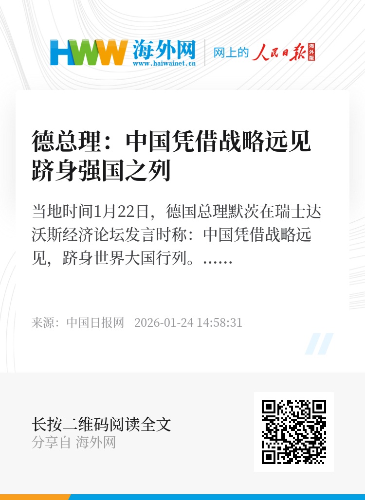 当地时间1月22日,德国总理默茨在瑞士达沃斯经济论坛发言时称:中国凭借战略远见,跻身世界大国行列。