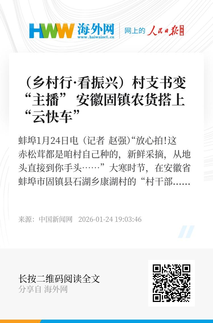 中新网蚌埠1月24日电 (记者 赵强)“放心拍!这赤松茸都是咱村自己种的,新鲜采摘,从地头直接到你手头……”