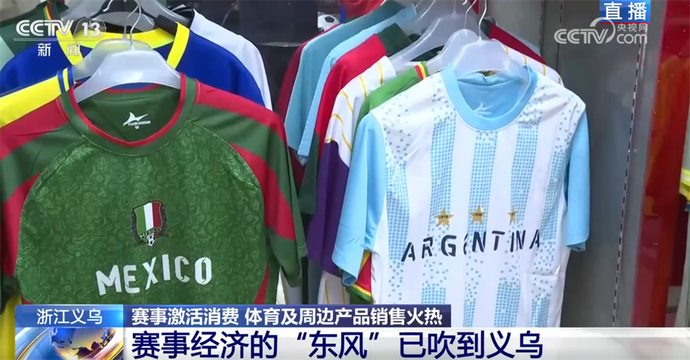 记者现在在义乌国际商贸城三区的体育用品专区,这家商户主营的是足球球迷服,大家还记得四年前的卡塔尔世界杯吗?当时这家店的老板通过观察各个参赛队球迷服的订单走势,特别是赛前那一波波的追单情况,成功预测了阿根廷队会夺冠!您看,体育经济和义乌市场之间就这样有了一次特别巧妙的联动。