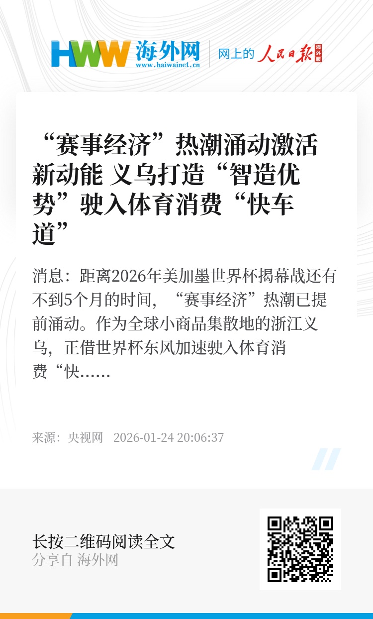央视网消息:距离2026年美加墨世界杯揭幕战还有不到5个月的时间,“赛事经济”热潮已提前涌动。作为全球小商品集散地的浙江义乌,正借世界杯东风加速驶入体育消费“快车道”,不少体育及其周边产品销售火热。一起来看前方记者带来的观察。