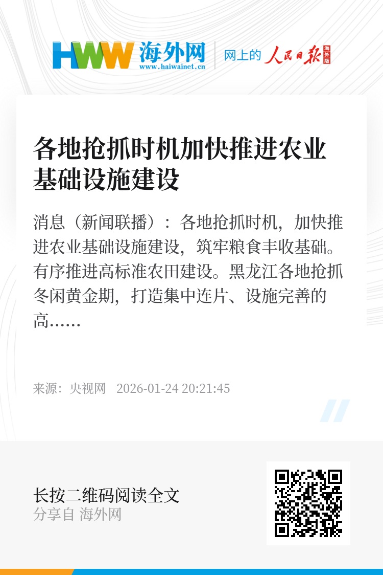 央视网消息(新闻联播):各地抢抓时机,加快推进农业基础设施建设,筑牢粮食丰收基础。