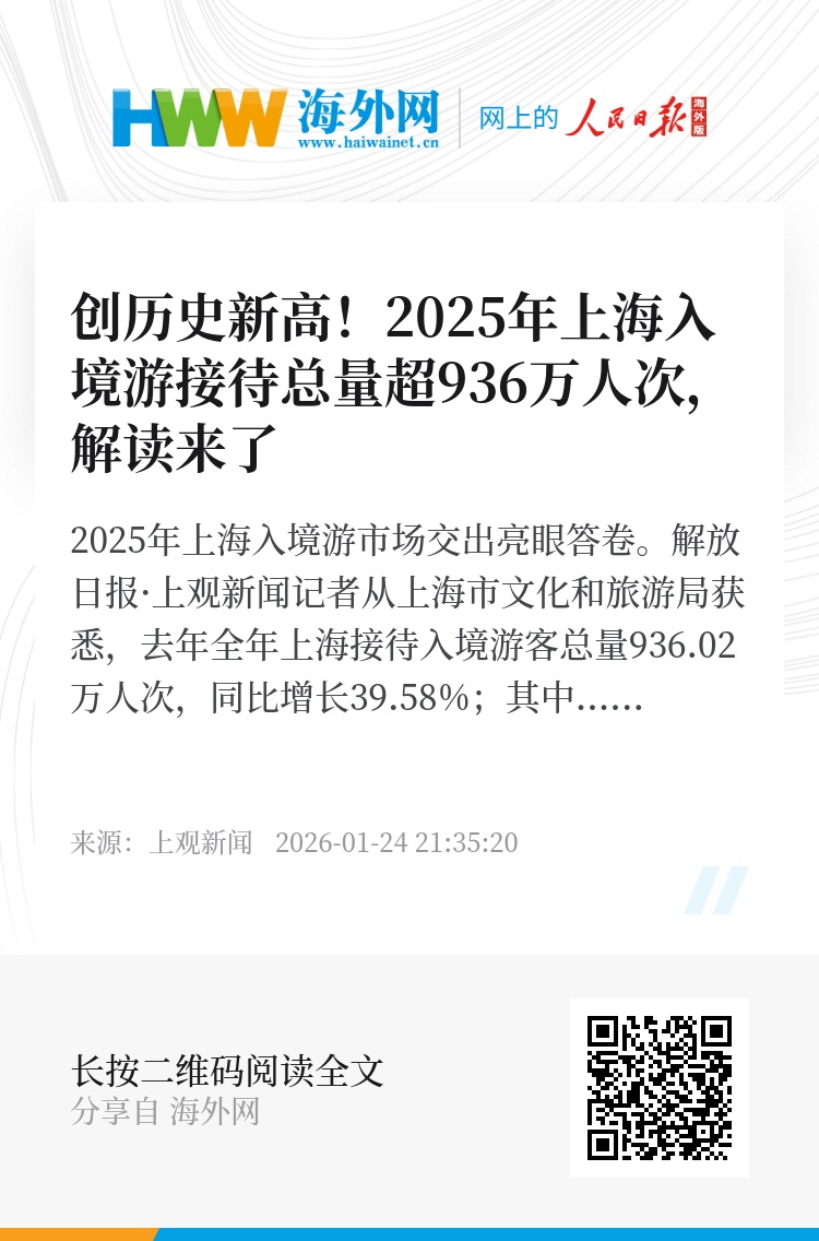 2025年上海入境游市场交出亮眼答卷。解放日报·上观新闻记者从上海市文化和旅游局获悉,去年全年上海接待入境游客总量936.02万人次,同比增长39.58%;其中入境过夜游客878.94万人次,同比增长45.09%,两项数据均创下历史新高。