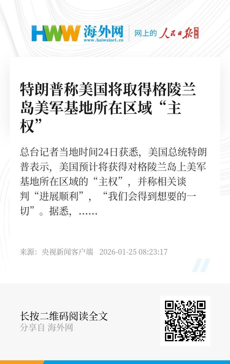 总台记者当地时间24日获悉,美国总统特朗普表示,美国预计将获得对格陵兰岛上美军基地所在区域的“主权”,并称相关谈判“进展顺利”,“我们会得到想要的一切”。