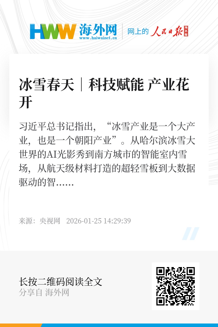 从哈尔滨冰雪大世界的AI光影秀到南方城市的智能室内雪场,从航天级材料打造的超轻雪板到大数据驱动的智慧运营体系……高科技的赋能,让冰雪经济从“一季一景”的“冷资源”发展成为“全年可享、全链繁荣”的“热产业”。