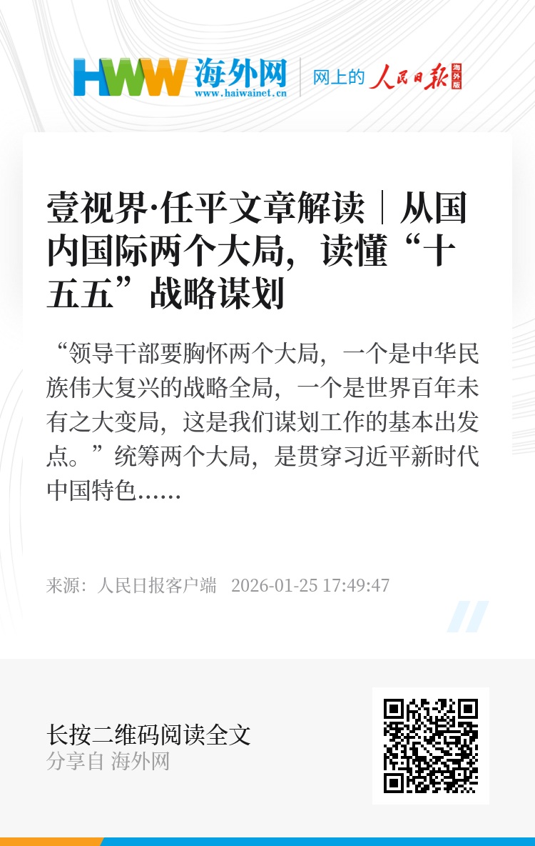 “十五五”规划建议对未来5年事关中国式现代化全局的战略任务作出部署,这是党中央统筹两个大局作出的顶层设计和战略擘画。从两个大局的高度,观察中国和世界关系正在发生的历史性变化,我们形成这样的认识: