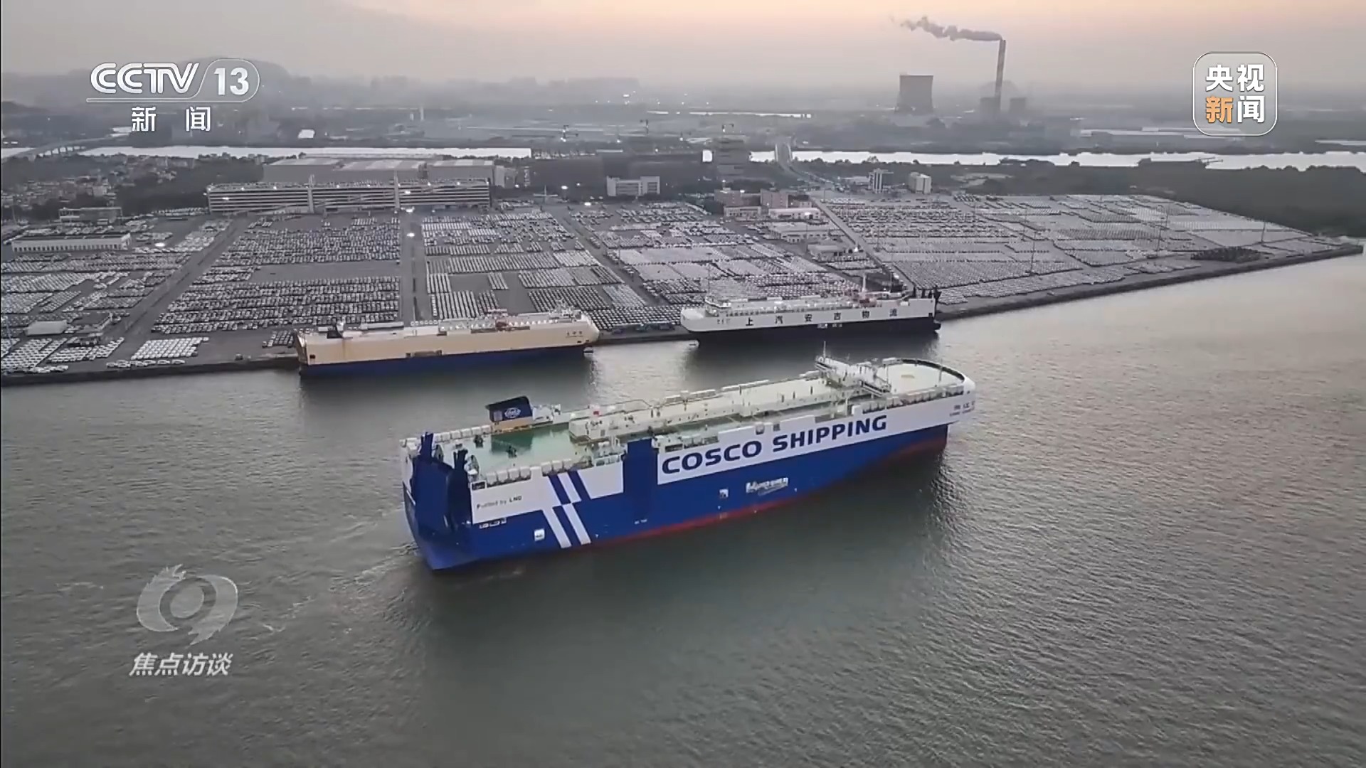 除了服务外贸的“硬支撑”在不断升级,“软环境”同样也在持续优化。广州港南沙汽车码头,一艘巨大的滚装船正在紧张作业。一辆辆驶向甲板的正是当前中国出口的“明星产品”——新能源汽车。
