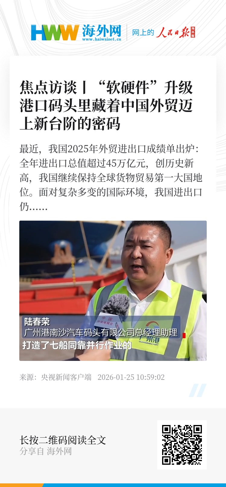 最近,我国2025年外贸进出口成绩单出炉:全年进出口总值超过45万亿元,创历史新高,我国继续保持全球货物贸易第一大国地位。面对复杂多变的国际环境,我国进出口仍然实现3.8%的较快增长,连续9年保持增长。应该说,在2025年,中国外贸展现出强大的韧性与活力,这份成绩单难能可贵。今天,我们走进港口、码头,近距离观察中国外贸的进阶之路。