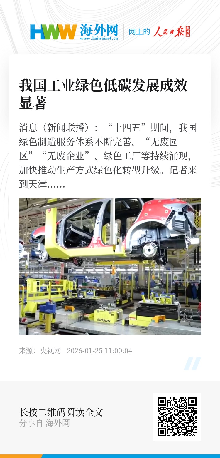央视网消息(新闻联播):“十四五”期间,我国绿色制造服务体系不断完善,“无废园区”“无废企业”、绿色工厂等持续涌现,加快推动生产方式绿色化转型升级。