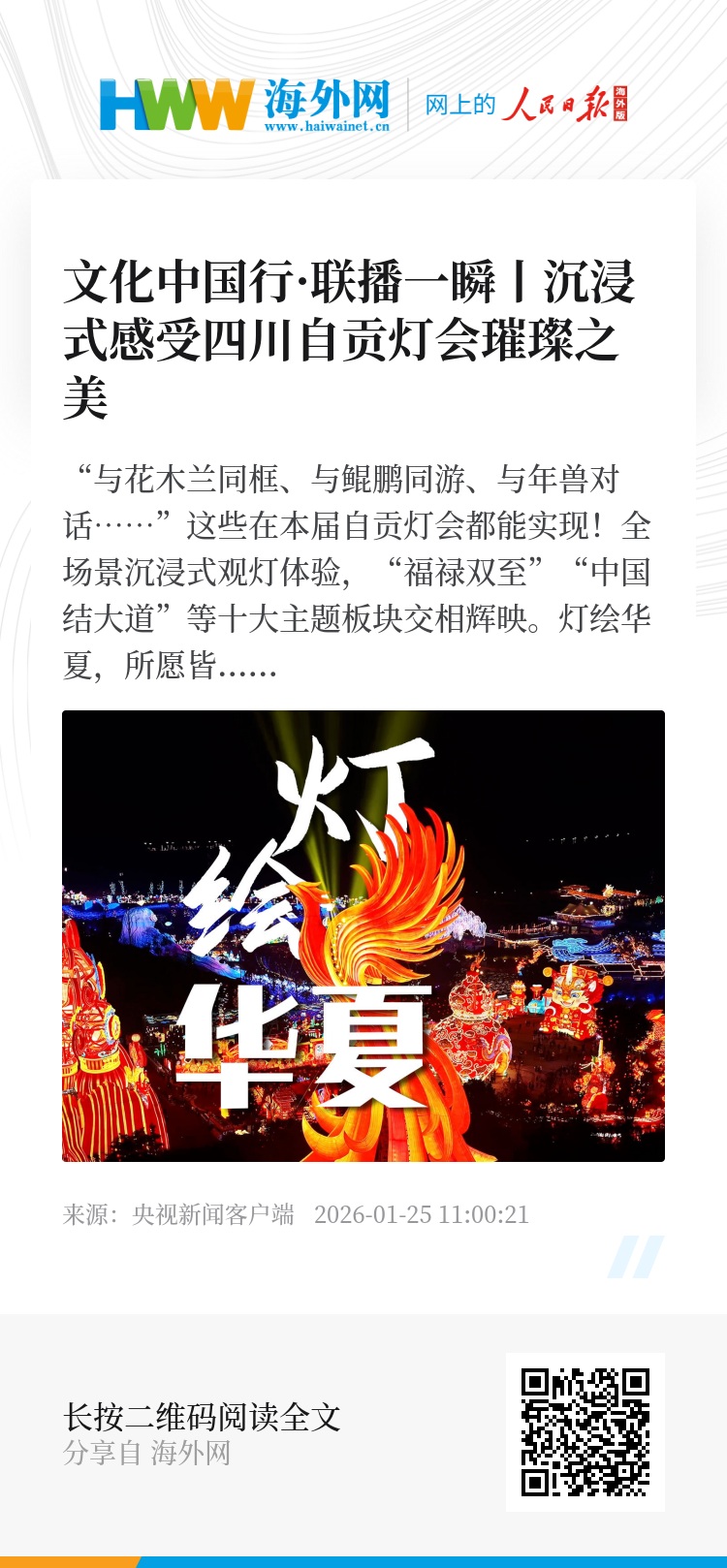 “与花木兰同框、与鲲鹏同游、与年兽对话……”这些在本届自贡灯会都能实现!全场景沉浸式观灯体验,“福禄双至”“中国结大道”等十大主题板块交相辉映。灯绘华夏,所愿皆璀璨!