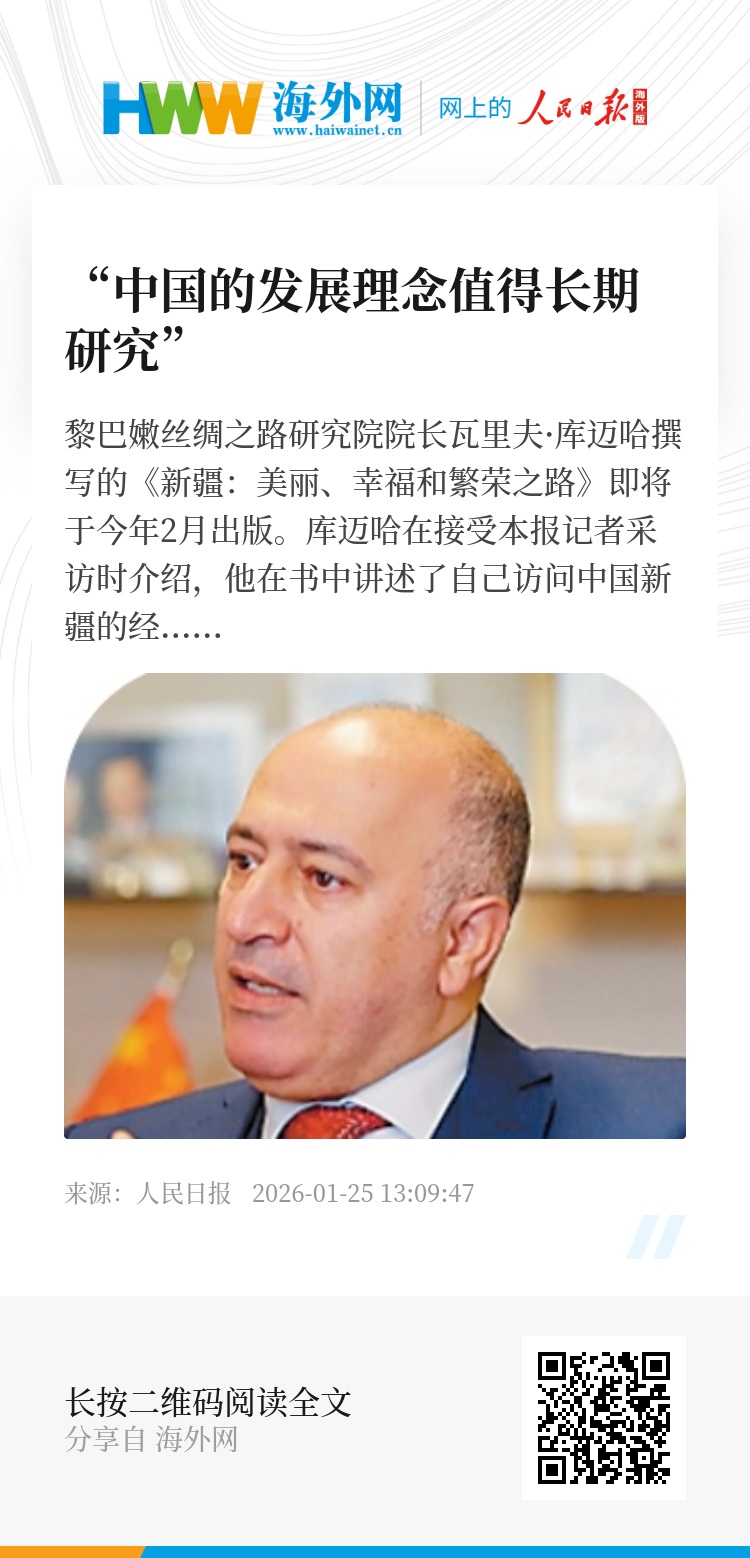 黎巴嫩丝绸之路研究院院长瓦里夫·库迈哈撰写的《新疆:美丽、幸福和繁荣之路》即将于今年2月出版。库迈哈在接受本报记者采访时介绍,他在书中讲述了自己访问中国新疆的经历,用独特视角向黎巴嫩读者呈现出一个多元多彩的新疆。书中还展示了库迈哈搜集的大量邮票,“以图为证”介绍中国的风土人情、阿中交往历史和共建“一带一路”上的友好故事。