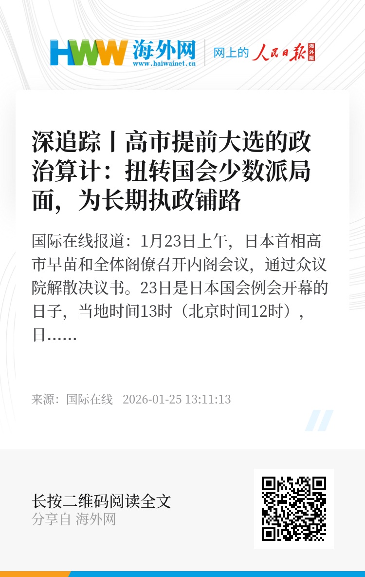此前,1月19日,日本首相高市早苗举行记者会并宣布,将于1月23日解散众议院、提前大选。这一消息引发外界关注,日本政局动向及未来政策走向再度成为焦点。清华大学当代国际关系研究院教授刘江永分析指出,高市此举旨在借当前较高支持率扭转国会少数派执政局面,并通过建立稳定政权为长期执政铺路。此次选举不仅是执政联盟与新政党“中道改革联合”之间的政治较量,其结果更将直接影响日本未来在国家安全战略、对美协调及对华政策等方面的走向。