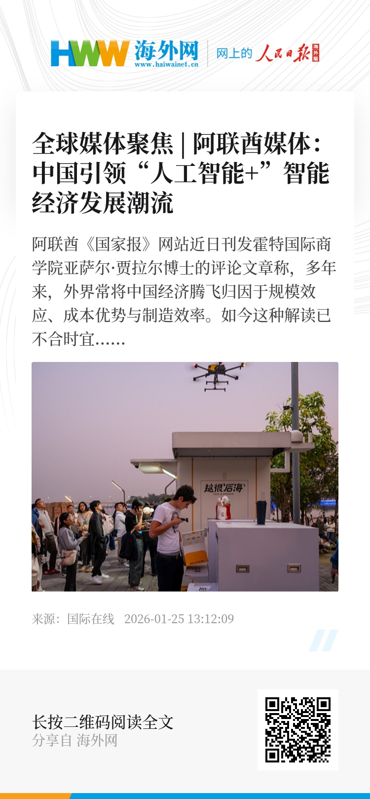 阿联酋《国家报》网站近日刊发霍特国际商学院亚萨尔·贾拉尔博士的评论文章称,多年来,外界常将中国经济腾飞归因于规模效应、成本优势与制造效率。如今这种解读已不合时宜。当前中国构建的经济形态更趋高端化、更具战略纵深。迈入2026年,中国正着力引领“人工智能+”智能经济发展浪潮。