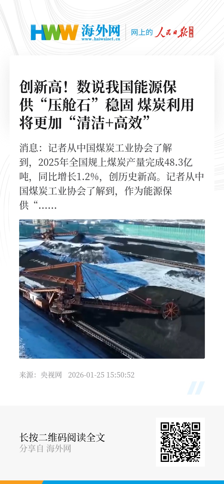 央视网消息:记者从中国煤炭工业协会了解到,2025年全国规上煤炭产量完成48.3亿吨,同比增长1.2%,创历史新高。