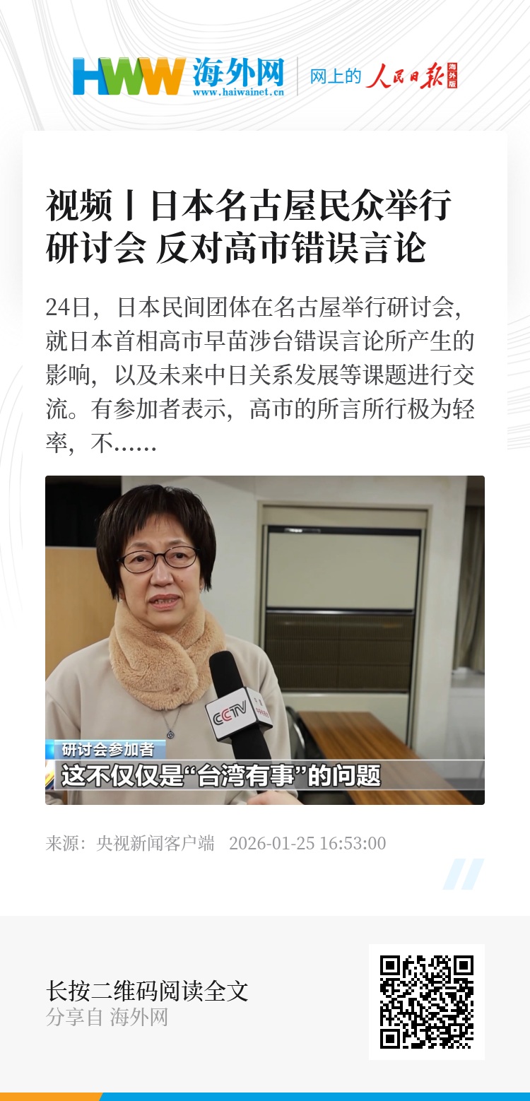 24日,日本民间团体在名古屋举行研讨会,就日本首相高市早苗涉台错误言论所产生的影响,以及未来中日关系发展等课题进行交流。有参加者表示,高市的所言所行极为轻率,不负责任。
