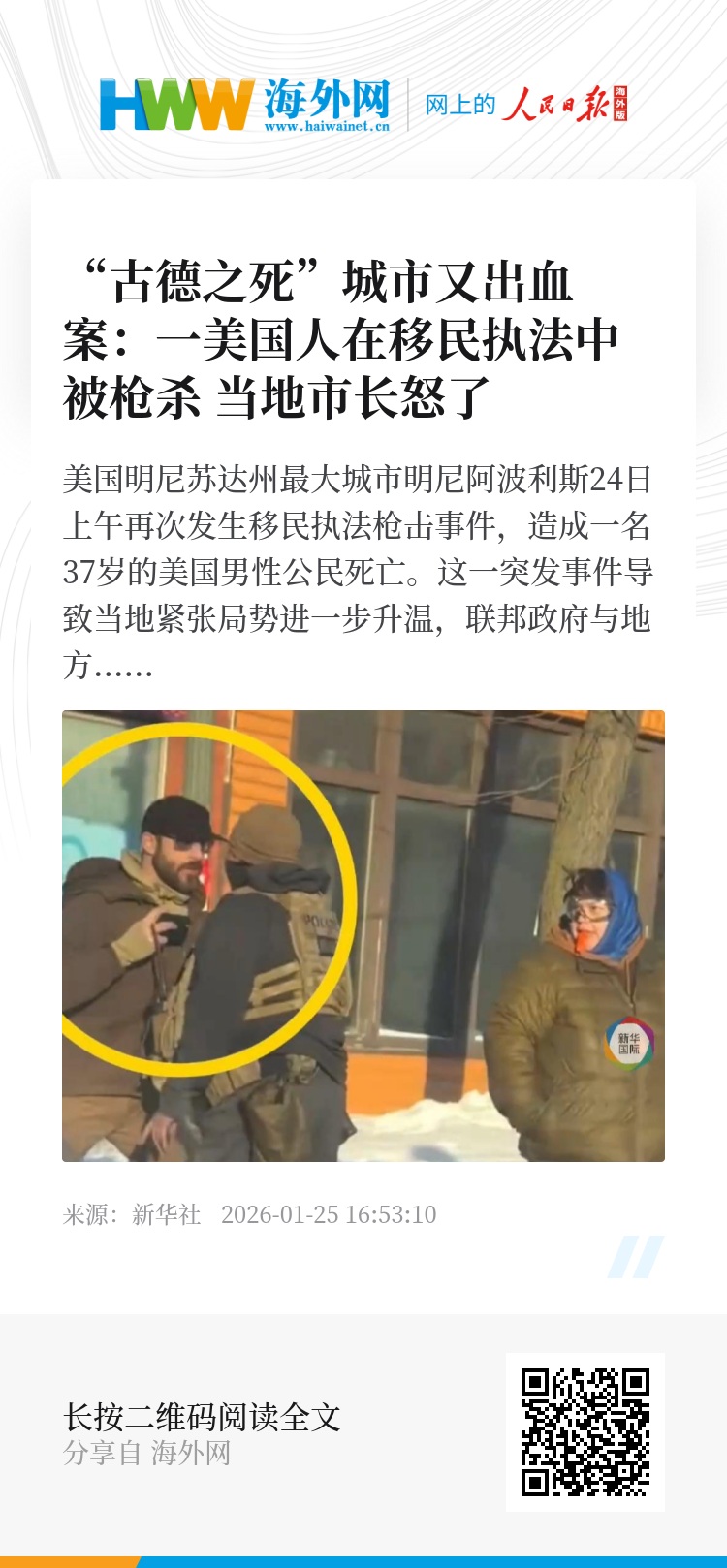美国明尼苏达州最大城市明尼阿波利斯24日上午再次发生移民执法枪击事件,造成一名37岁的美国男性公民死亡。这一突发事件导致当地紧张局势进一步升温,联邦政府与地方政府分歧进一步加剧。