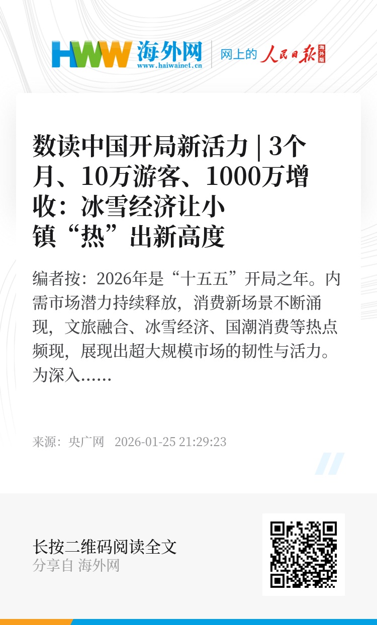 编者按:2026年是“十五五”开局之年。内需市场潜力持续释放,消费新场景不断涌现,文旅融合、冰雪经济、国潮消费等热点频现,展现出超大规模市场的韧性与活力。为深入解读开局新气象,央广网推出《数读中国开局新活力》系列报道,以数据为支撑,聚焦各地消费场景、产业升级与民生改善的生动实践,呈现中国经济稳中求进、活力迸发的时代图景。