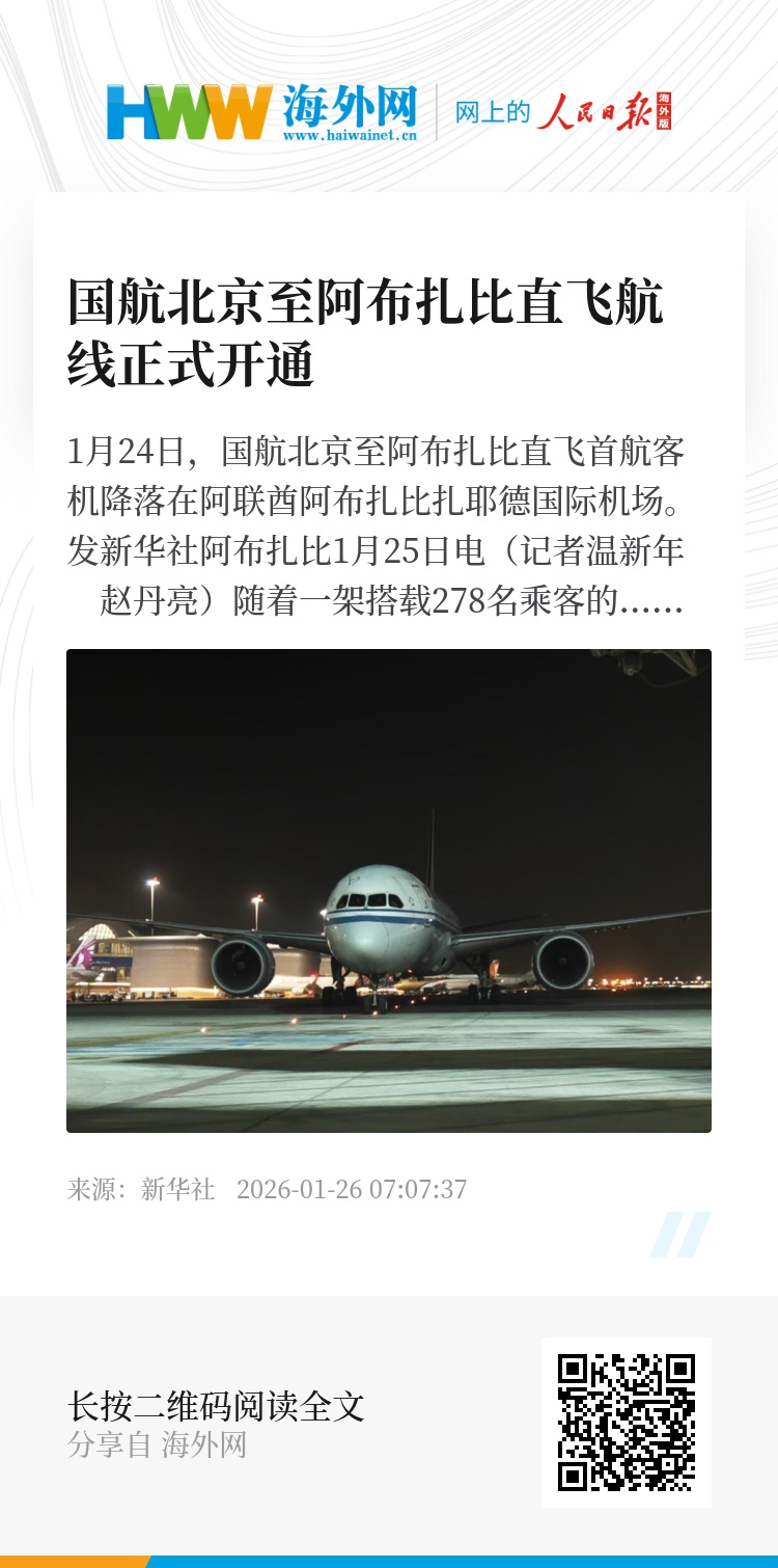 该航线是国航2026年新开通的首条国际航线,采用波音787机型执飞,每周往返4班。航线的开通进一步完善了中阿航空网络布局,为两国人员往来、经贸合作和人文交流提供了更加高效便捷的空中通道。